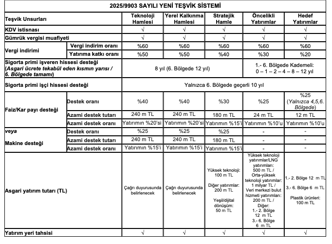 30 Mayıs 2025 tarihinde kararı yayımlanan Yeni Teşvik Sistemi (2025/9903 Sayılı Yatırımlardaki Devlet Yardımları Hakkındaki Karar) uygulama esasları, 21 Haziran 2025 tarihli ve 32933 sayılı Resmi Gazete’de 2025/1 sayılı tebliğ ile yayımlanarak yürürlüğe girmiştir. Yeni Teşvik Sistemi detayları aşağıdadır: